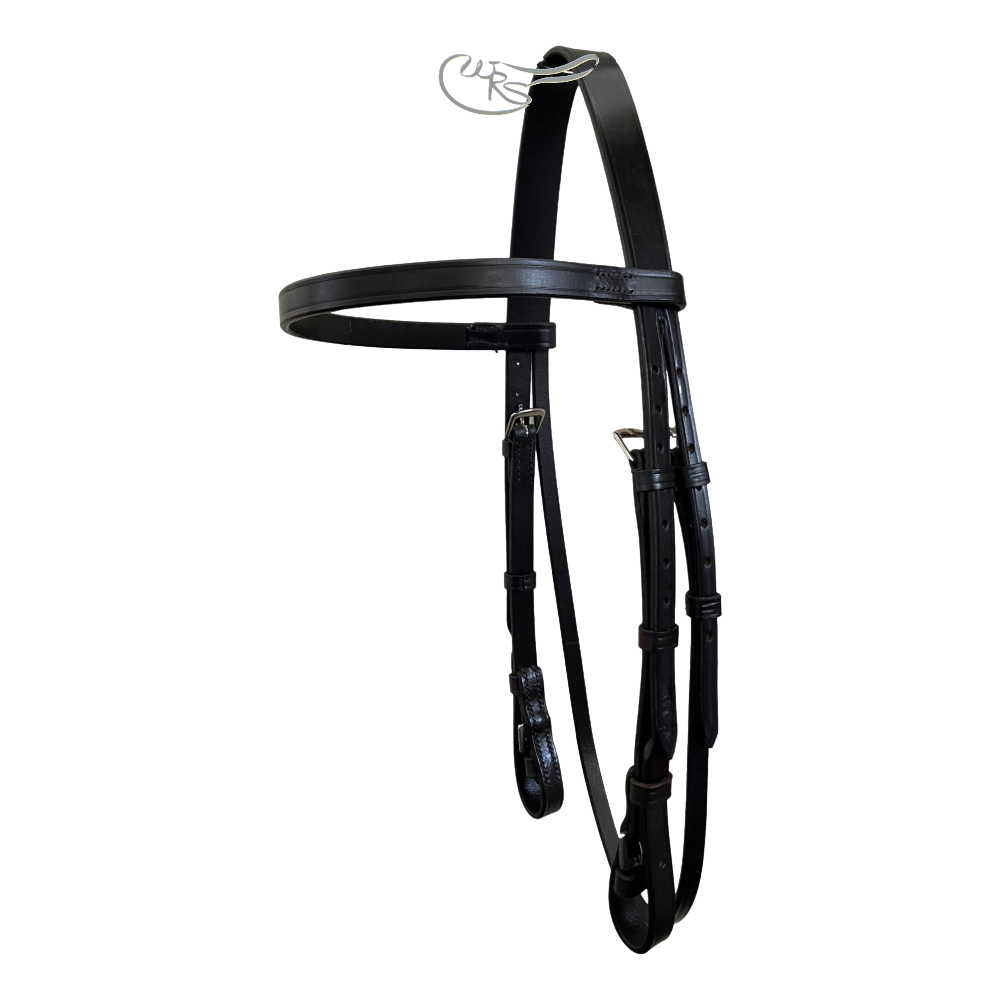 Quality English Dark Havana leather headstall. Buckle cheekpieces. Suitable for racing.